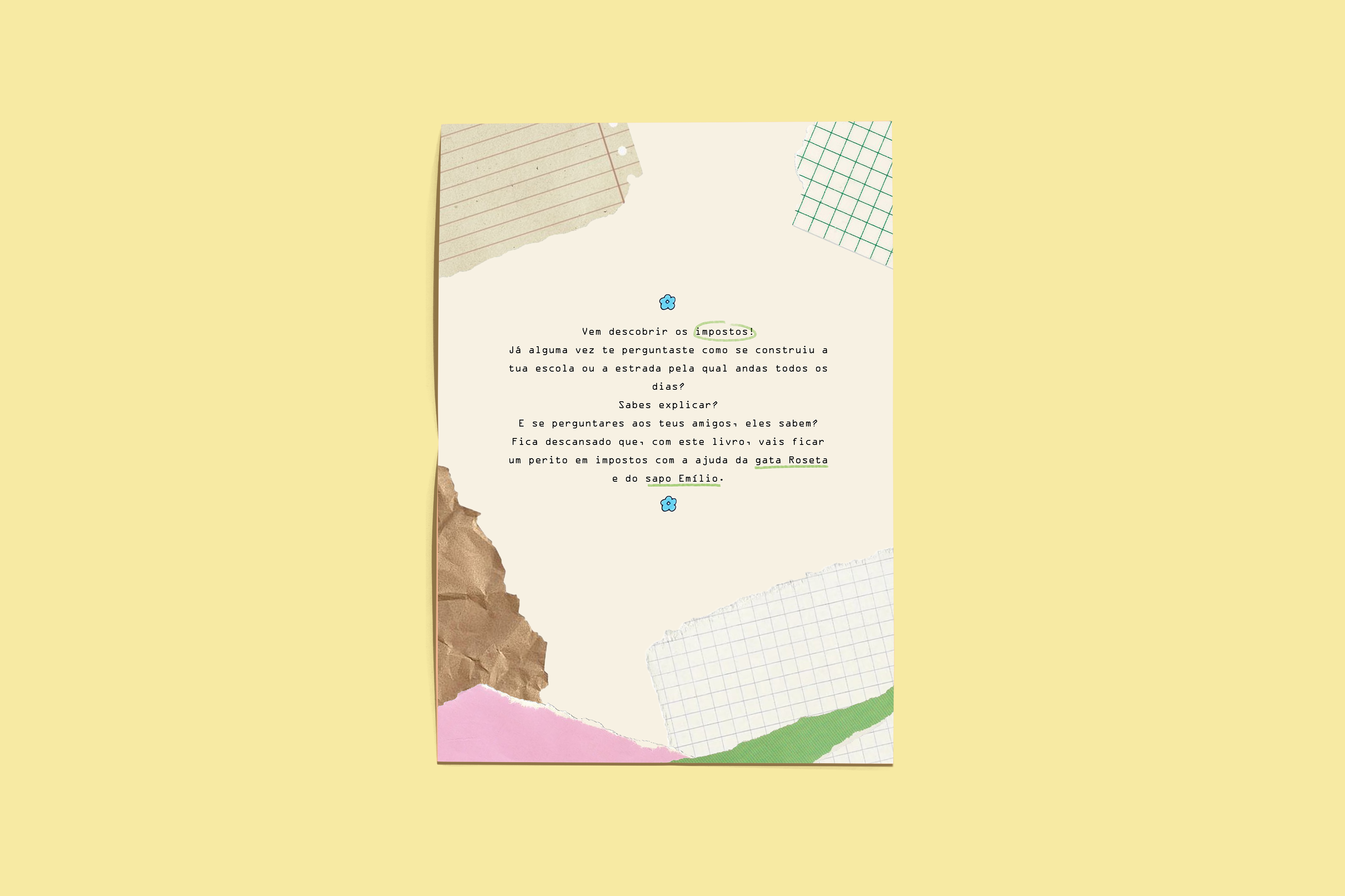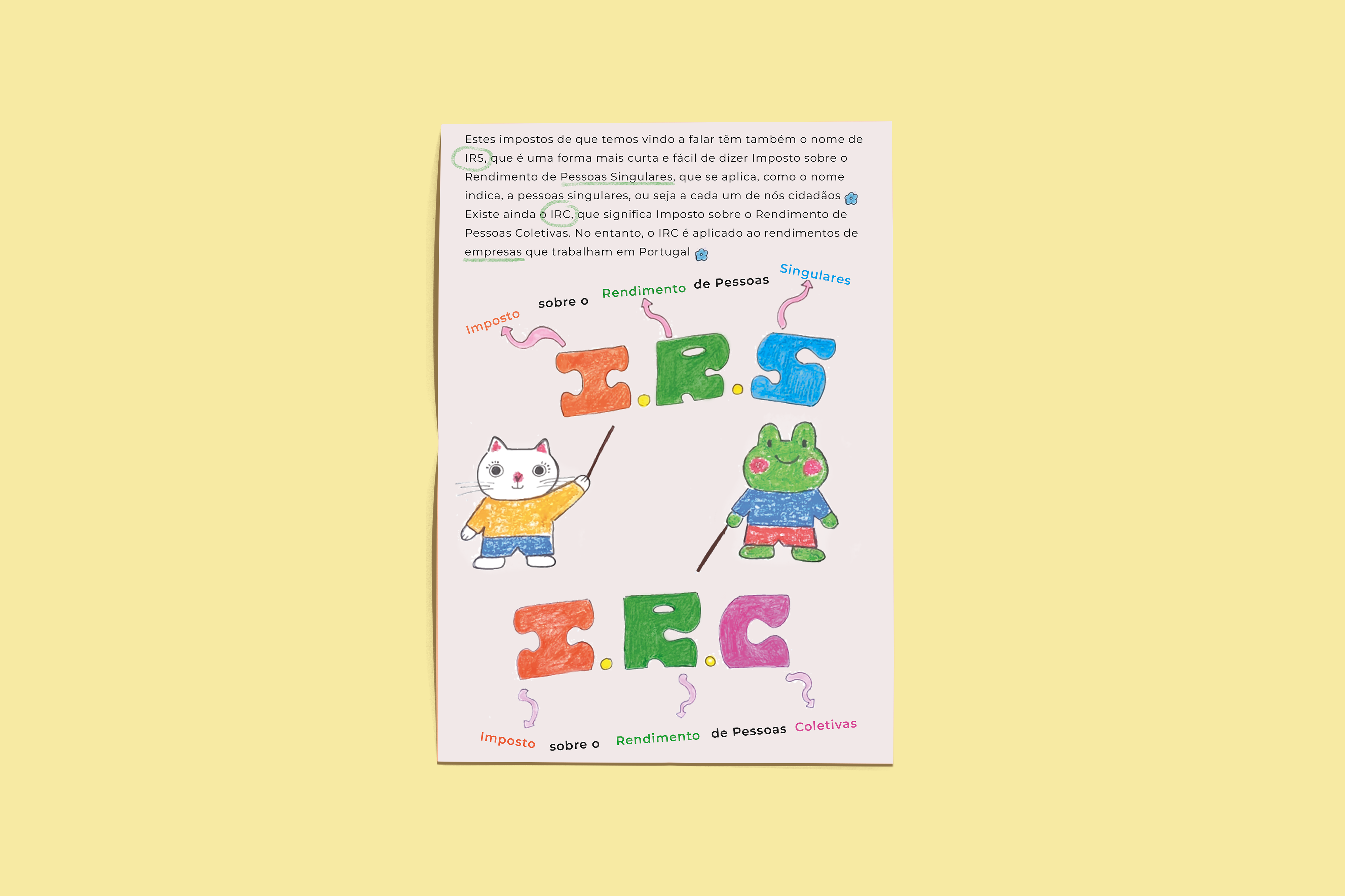 Como parte do módulo Ilustração Infantil, do cuso de Ilustração da World Academy, desenvolvi este livro para os mais novos. Mais especificamente para crianças entre os 7 e os 10 anos. Nele criei duas personagens: uma gata chamada Roseta e um sapo chamado Emílio. Juntos explicam de forma simples e engraçada o que são os impostos e a diferença entre IRS e IRC.