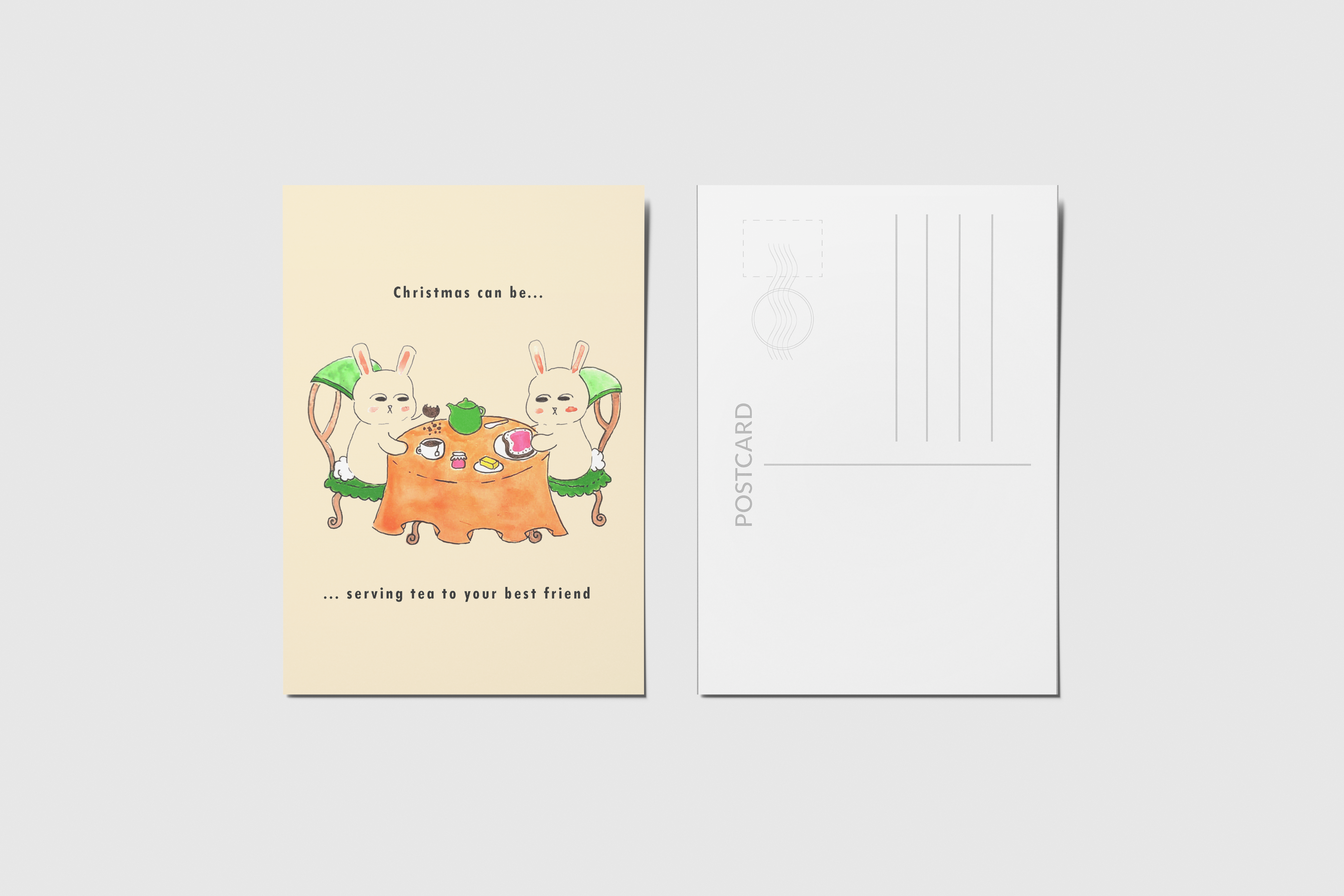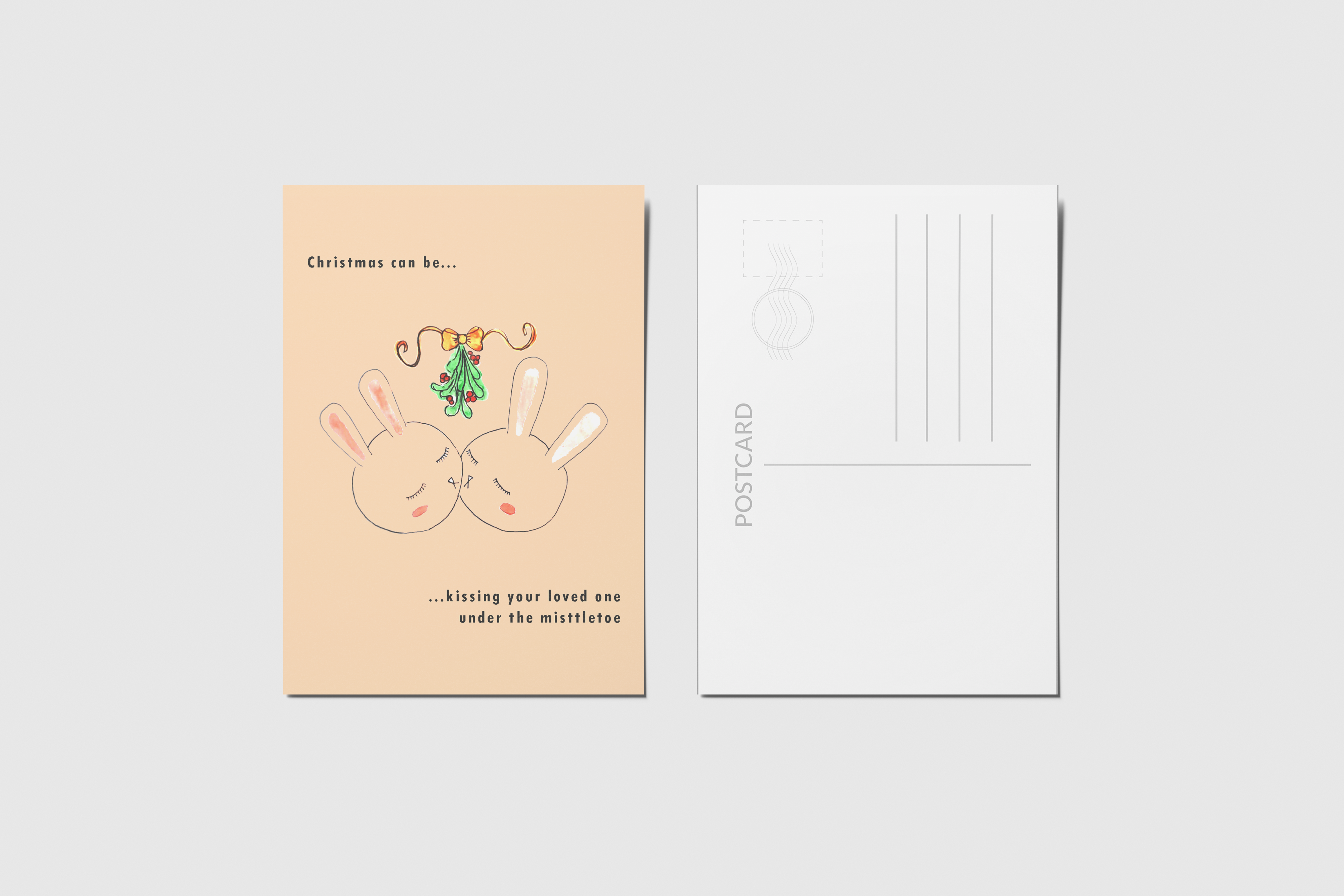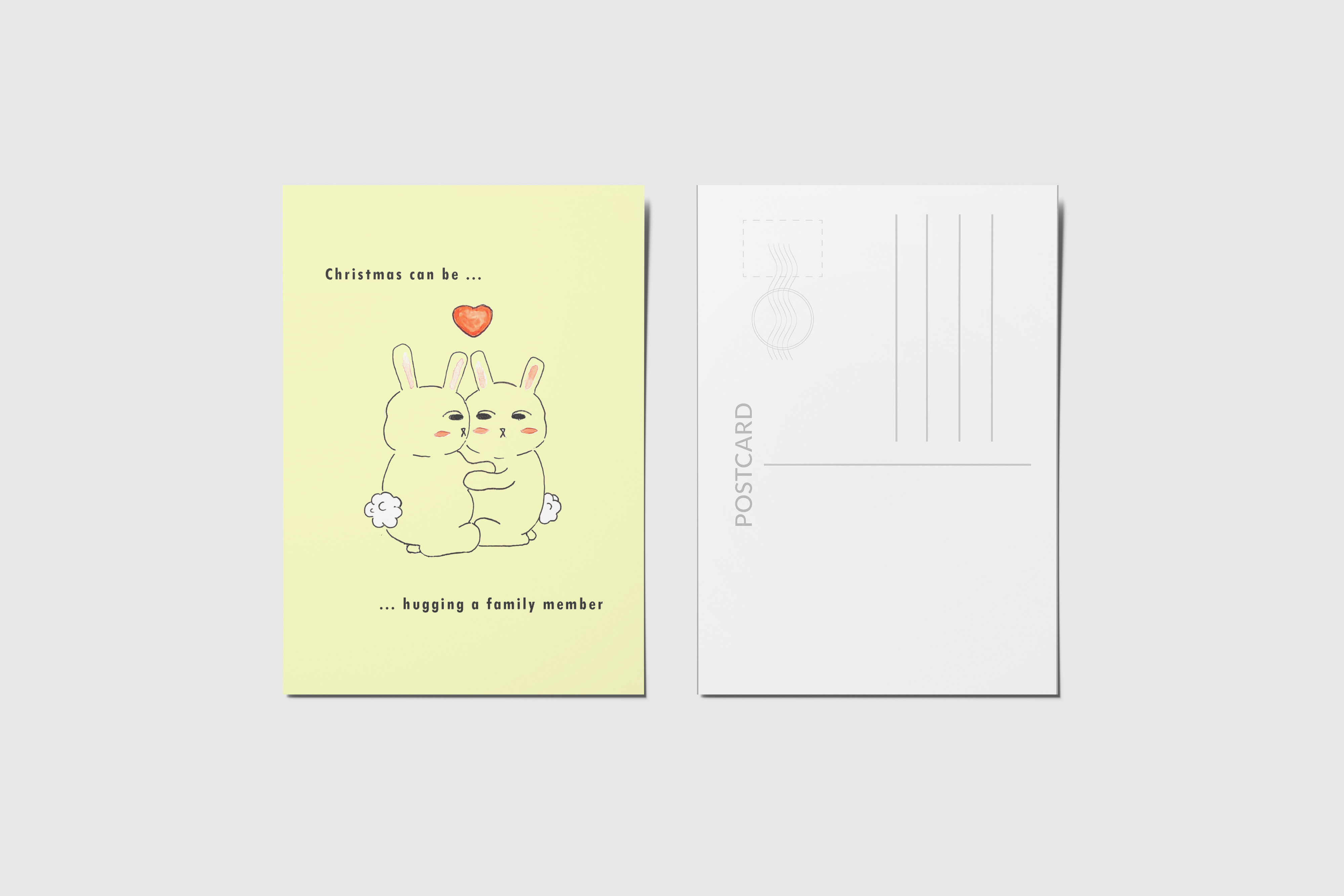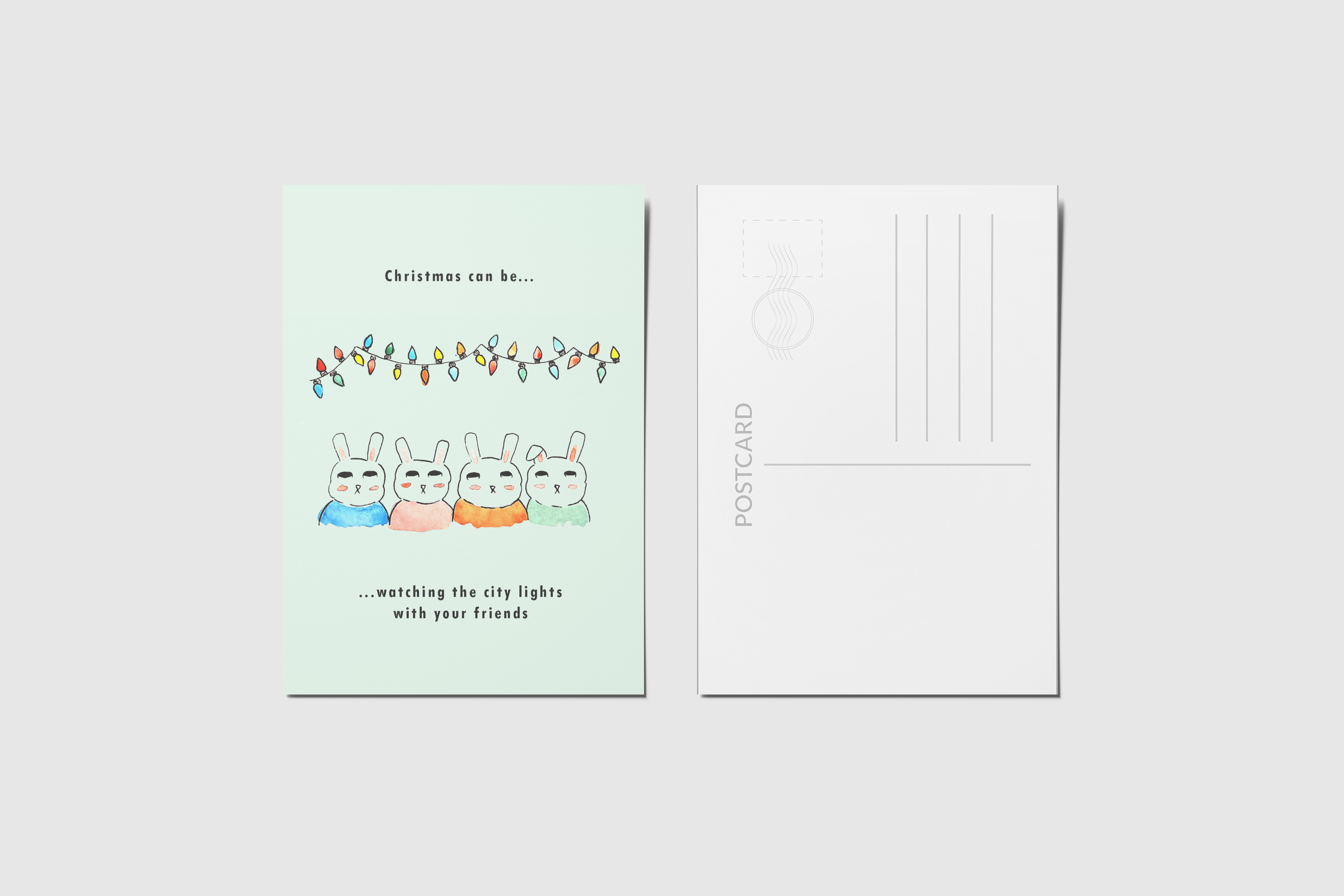 No âmbito do módulo de Editorial do curso de Ilustração da World Academy e com a ajuda do ilustrador Filipe Abranches, desenvolvi este conjunto de postais. Decidi fazer especificamente para a época natalícia, sendo que era essa a época em que nos encontrávamos. Cada postal tem presente a personagem de um coelho, bem como uma frase natalícia. O que une todos os postais é que todos são exemplos de diferentes significados que o Natal pode apresentar dependendo de pessoa para pessoa. Todas as ilustrações foram desenhadas e pintadas à mão.
